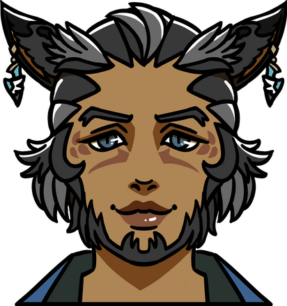 Vihn is a scraggly Miqo’te with tired blue eyes, a hastily-trimmed mane and a tufted tail. He is small for a male Seeker, notably shorter than his tribemate, X’rhun. Though generally fit, his body has softened a bit around the chest, waist and upper arms.Vihn has prominent, petal-like tattoos on his temples. He insists these were awarded to him for his first successful hunt. To those members of a certain X Tribe clan, however, they betray Vihn’s former status as a nunh.